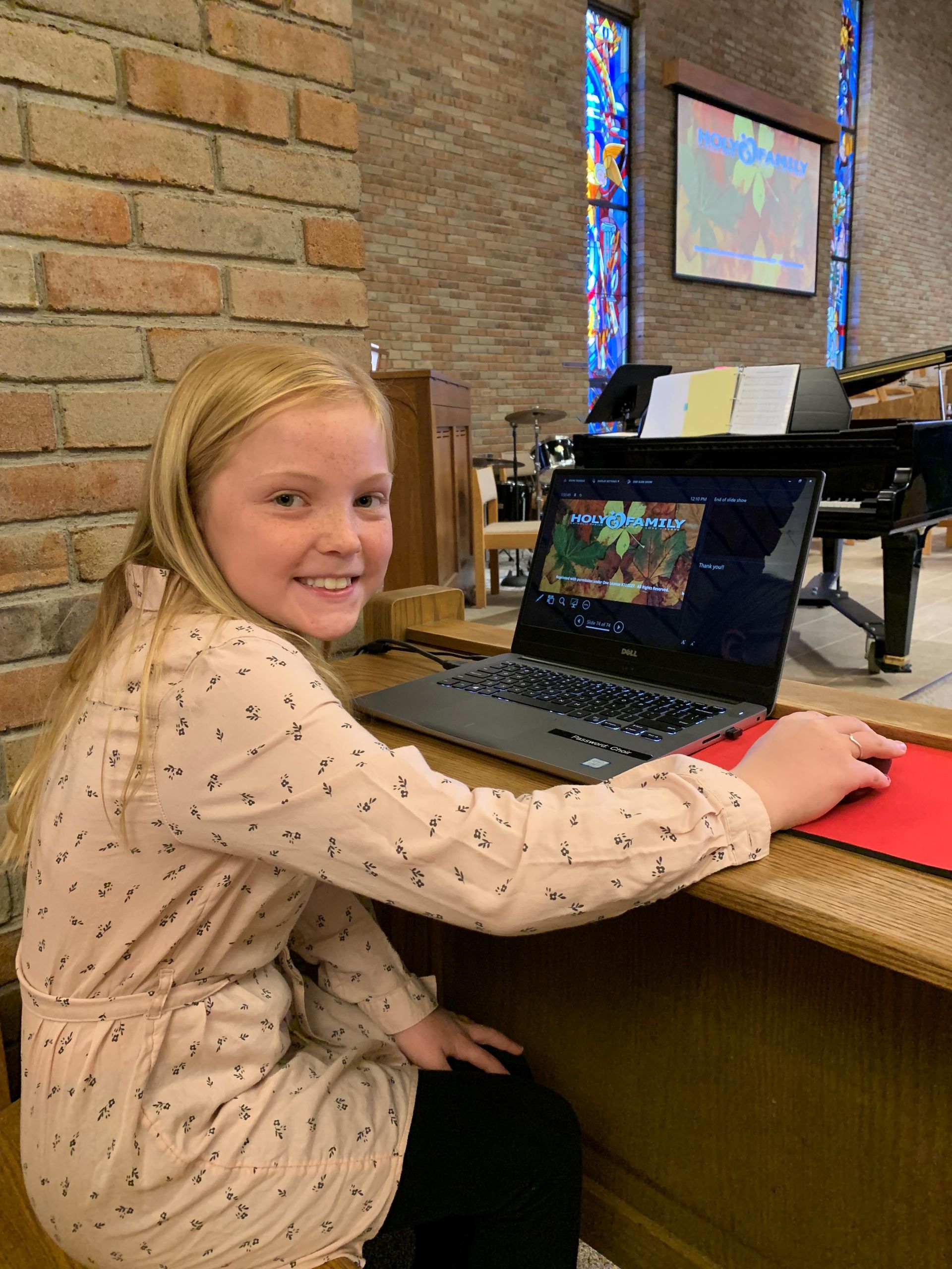 Our Projection Crew volunteers are essential to helping us sing as an assembly. This is an important and easy way to volunteer. For every weekend Mass, we need one person to run the computer for the slides that appear on the screens for all hymns. This ministry is open to students 4th grade or older. Many families take on this ministry together. Each volunteer is assigned one weekend Mass per month.